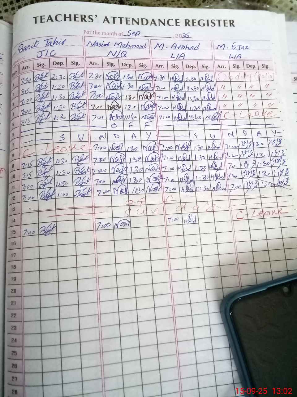 | CNIC | Full Name | Designation | R/C | Absence during last cal. month |