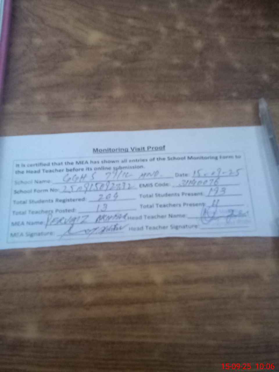 | Attendance Register | Head Teacher | MEA with School | Visit Proof |