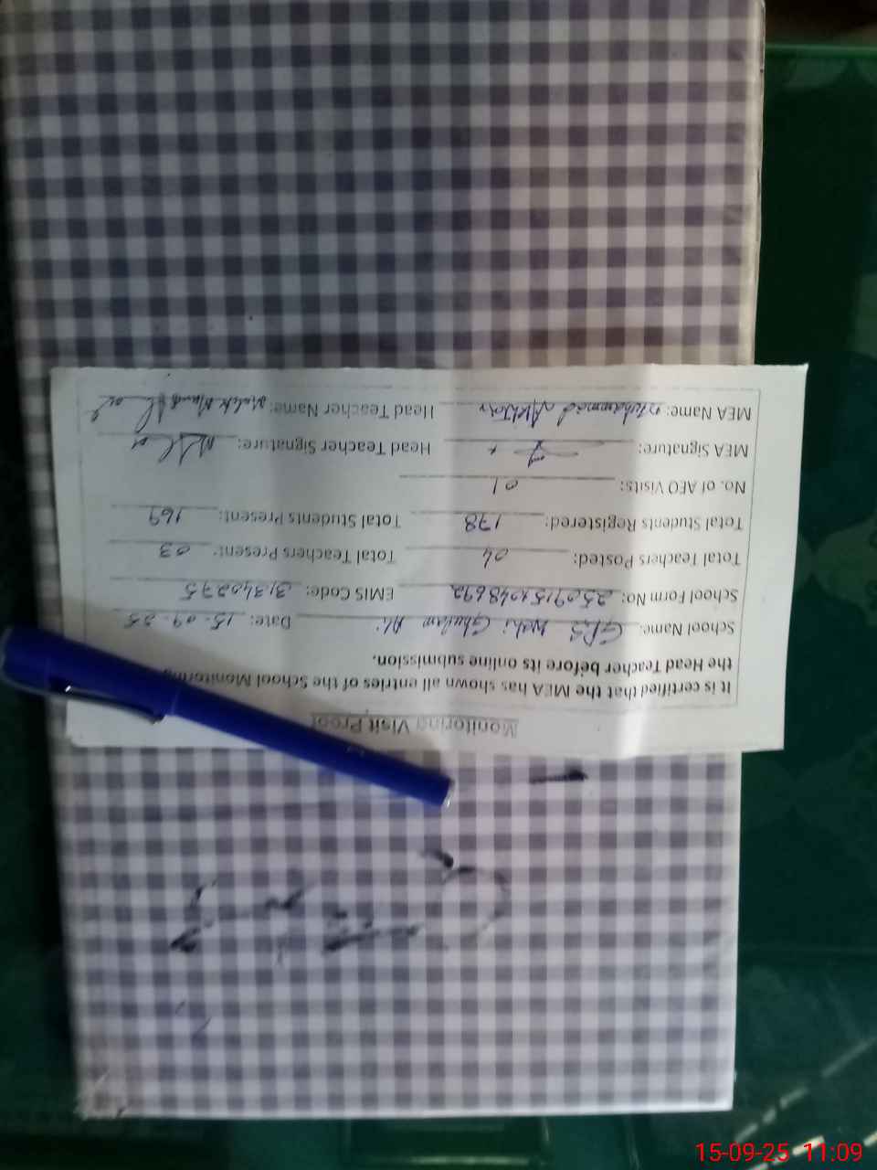 | Attendance Register | Head Teacher | MEA with School | Visit Proof |