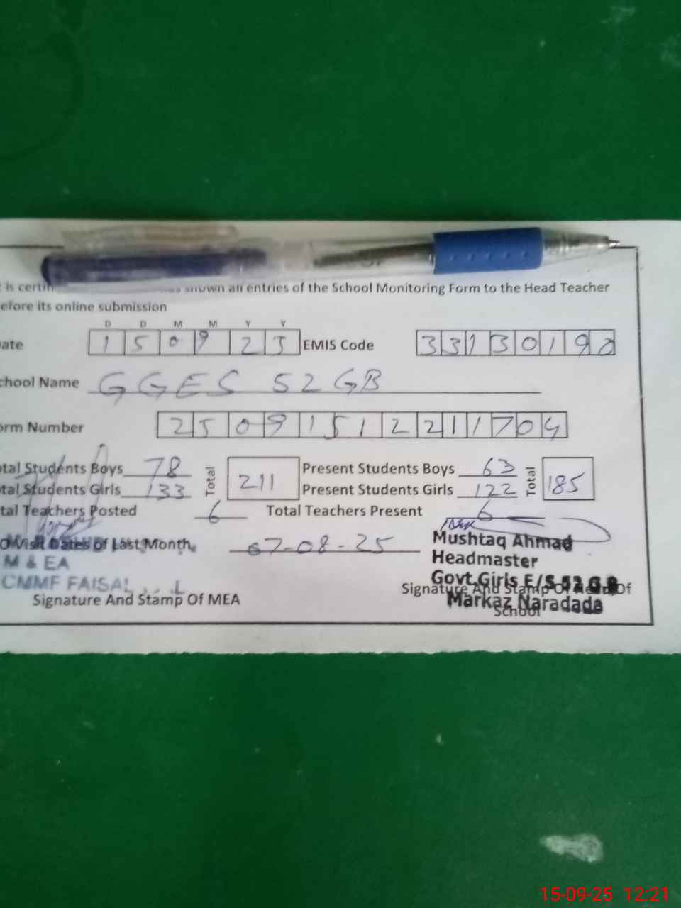 | Attendance Register | Head Teacher | MEA with School | Visit Proof |