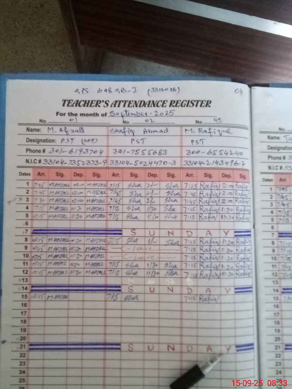 | CNIC | Full Name | Designation | R/C | Absence during last cal. month |