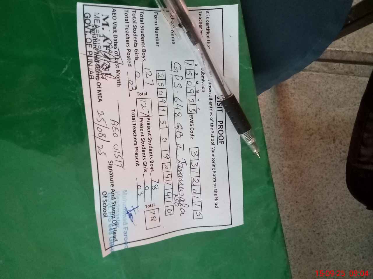 | Attendance Register | Head Teacher | MEA with School | Visit Proof |
