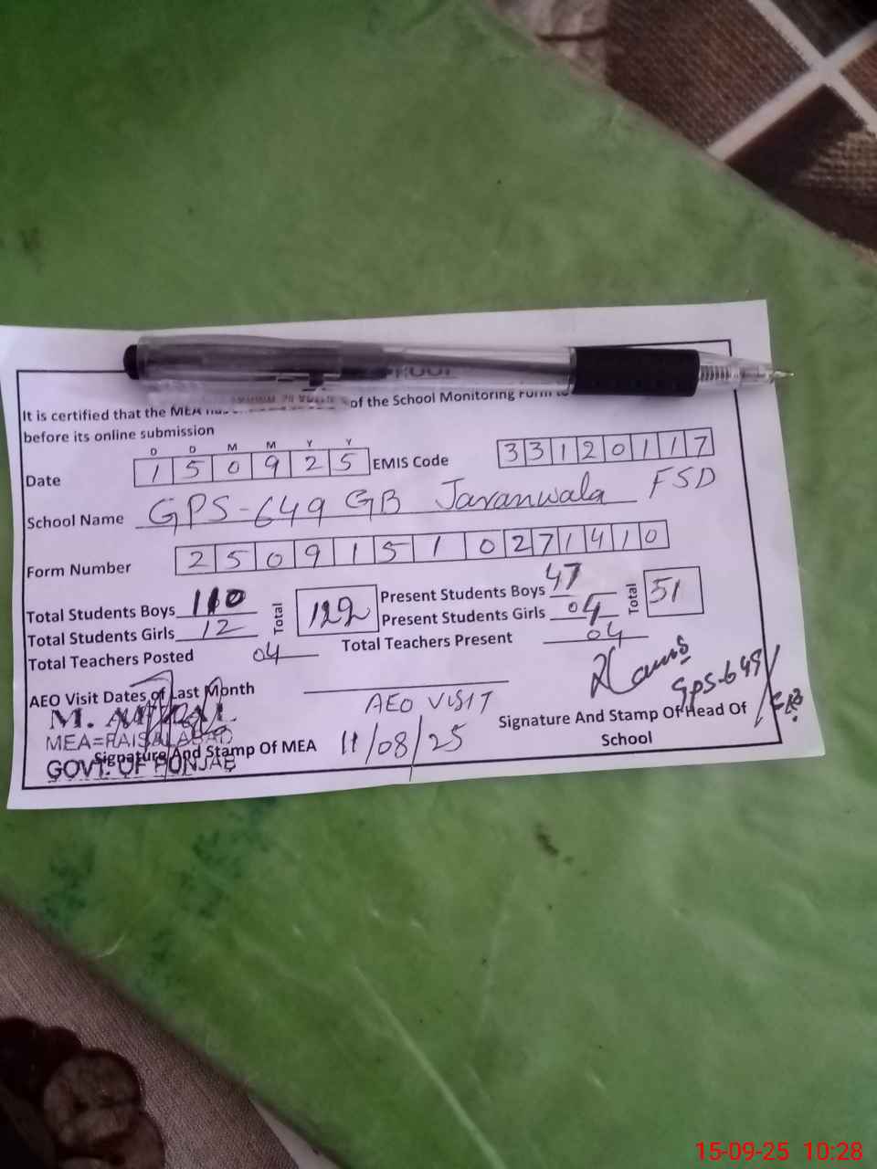 | EMIS Code: 33120117 | Name of School: GPS CHAK 649 GB | |||