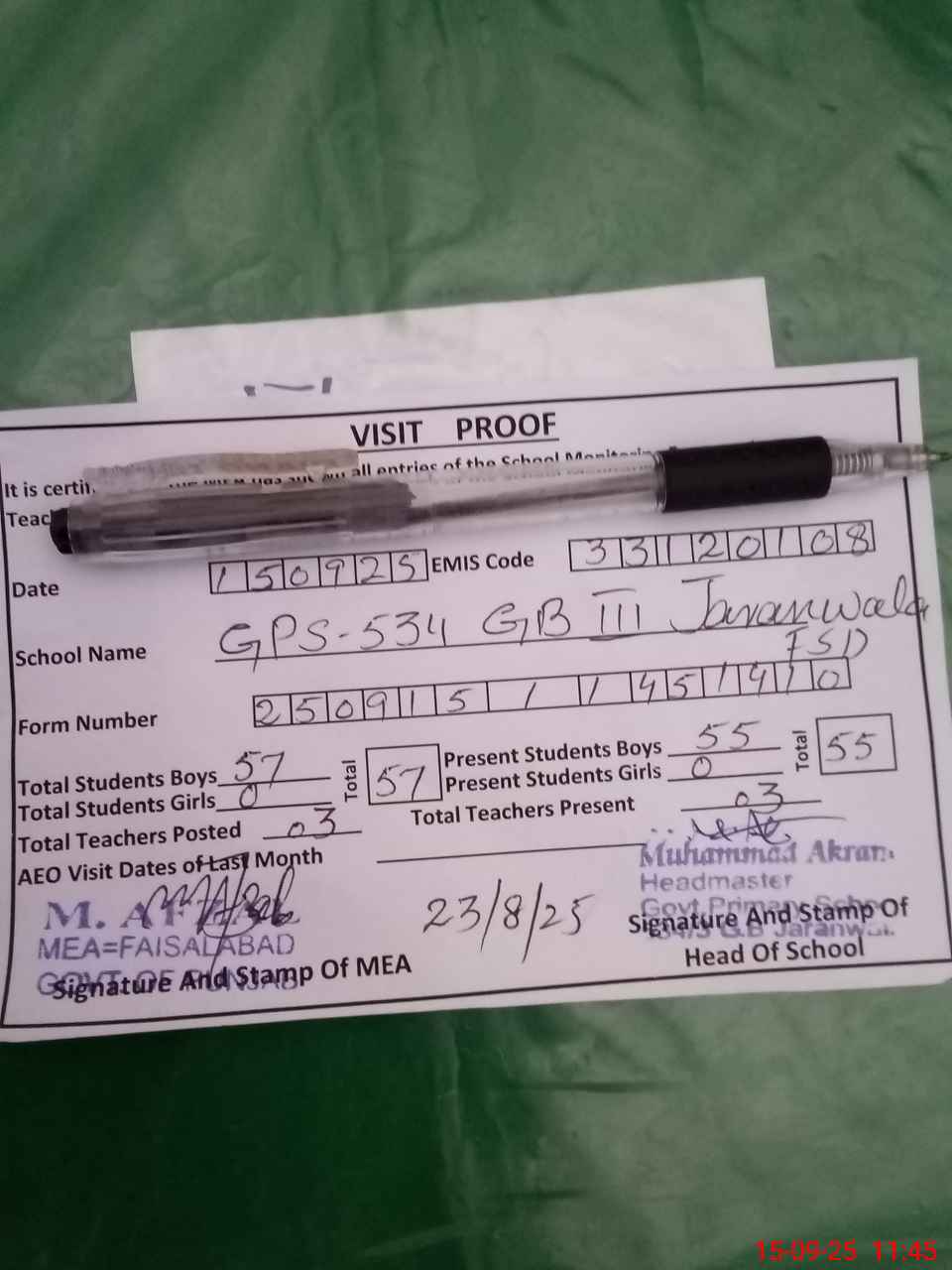 | Attendance Register | Head Teacher | MEA with School | Visit Proof |