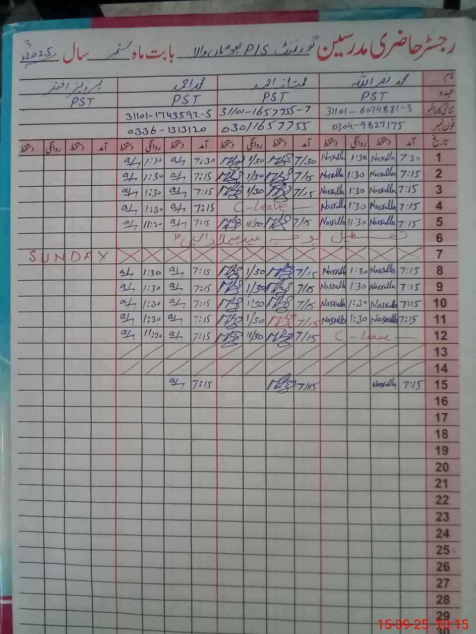 | CNIC | Full Name | Designation | R/C | Absence During Last Calender Month |