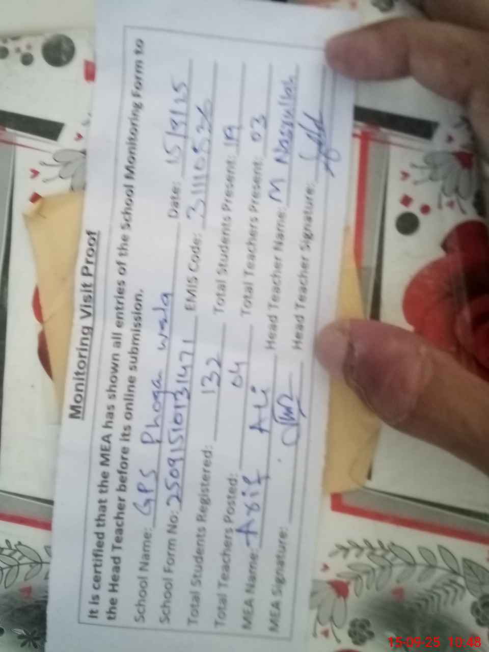 | Attendance Register | Head Teacher | MEA with School | Visit Proof |