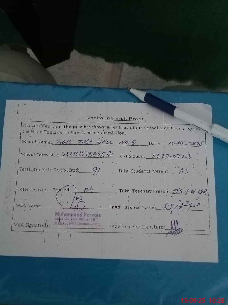 | Attendance Register | Head Teacher | MEA with School | Visit Proof |