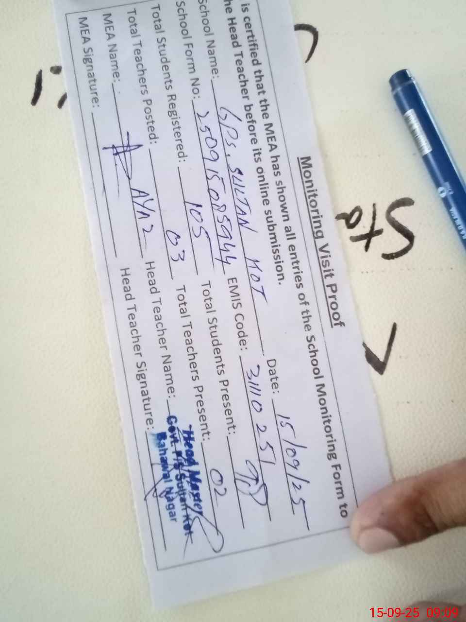 | Attendance Register | Head Teacher | MEA with School | Visit Proof |