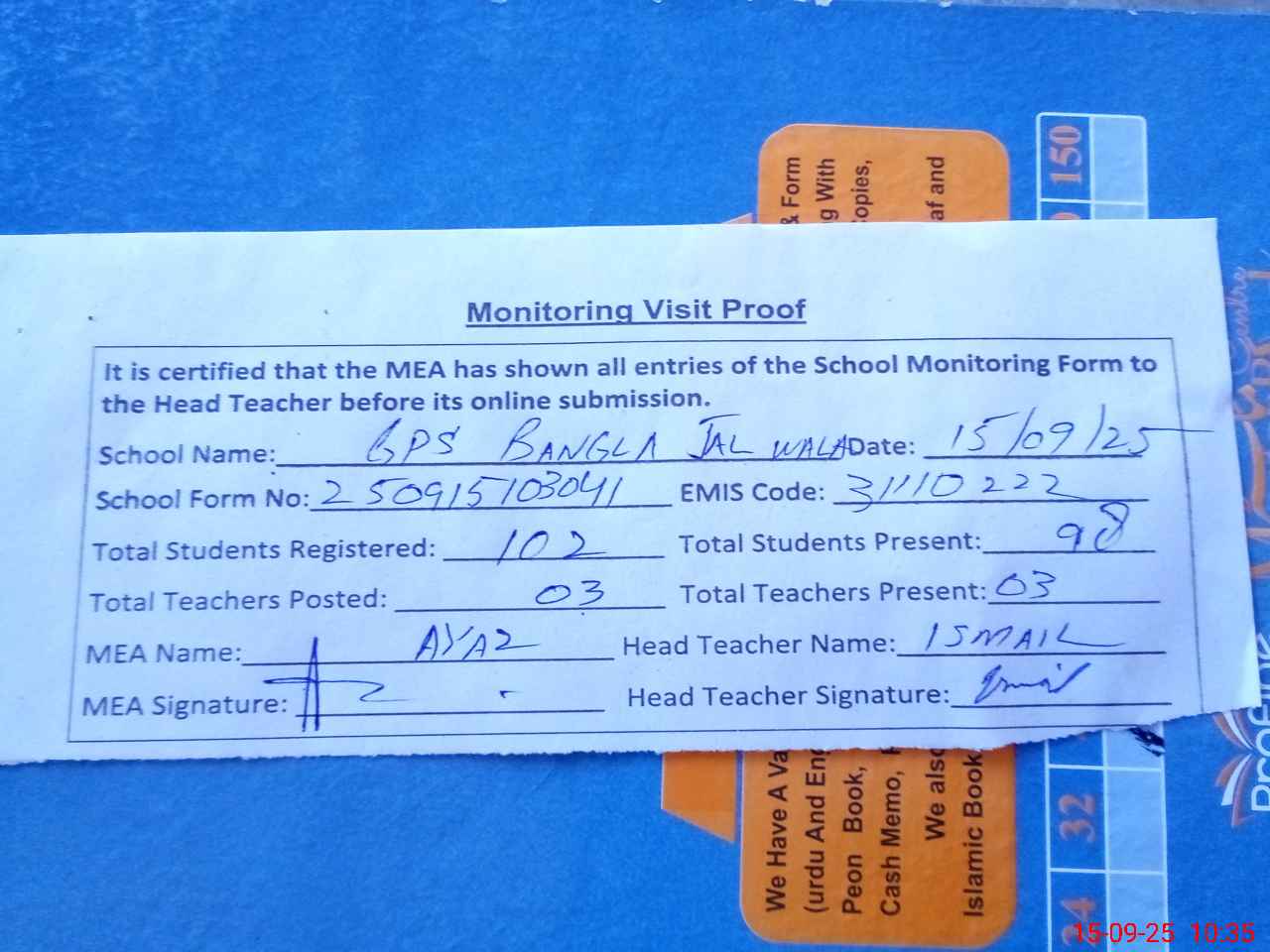 | EMIS Code: 31110222 | Name of School: GPS BANGLA JAL WALA | |||