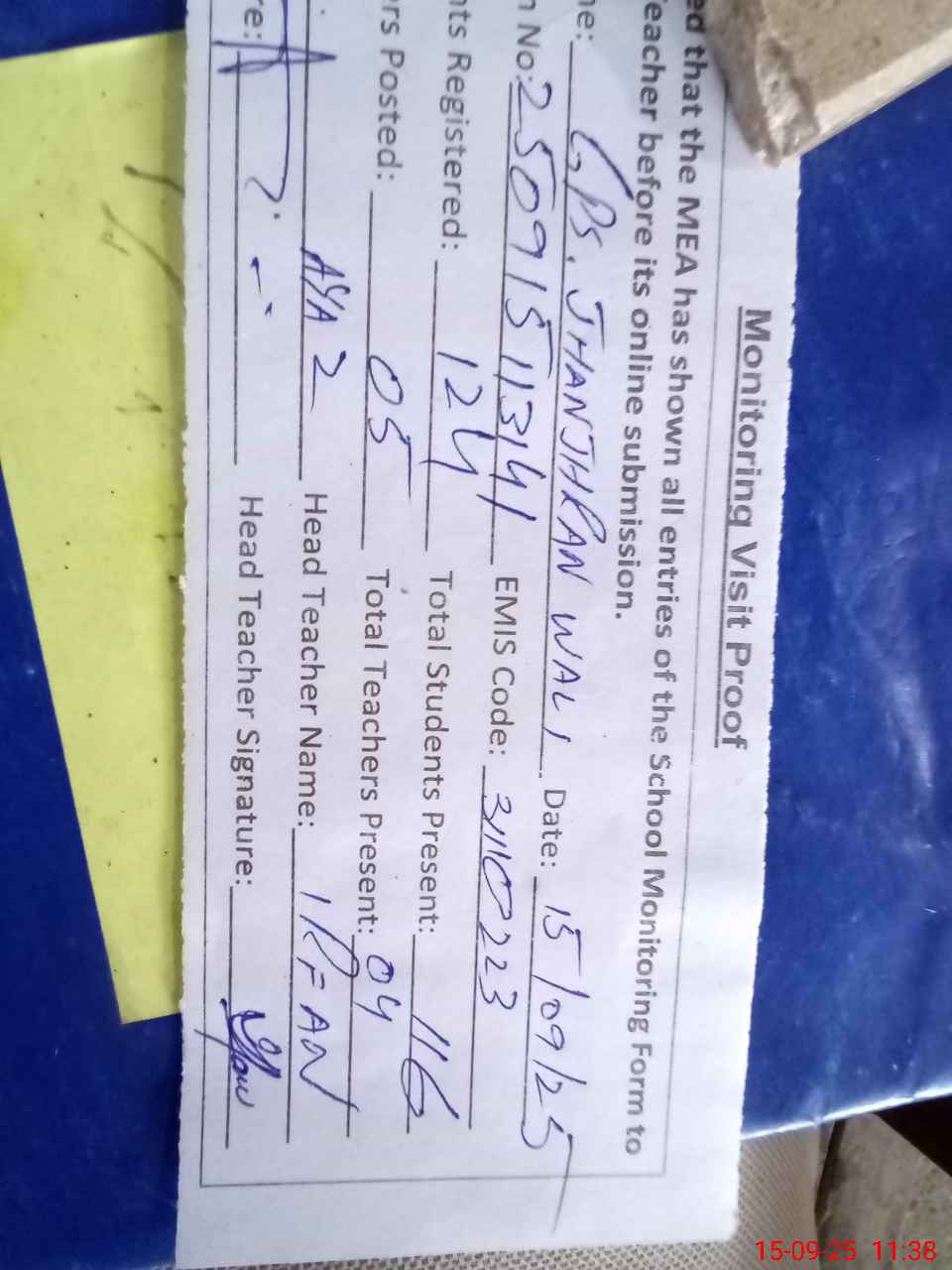 | Attendance Register | Head Teacher | MEA with School | Visit Proof |