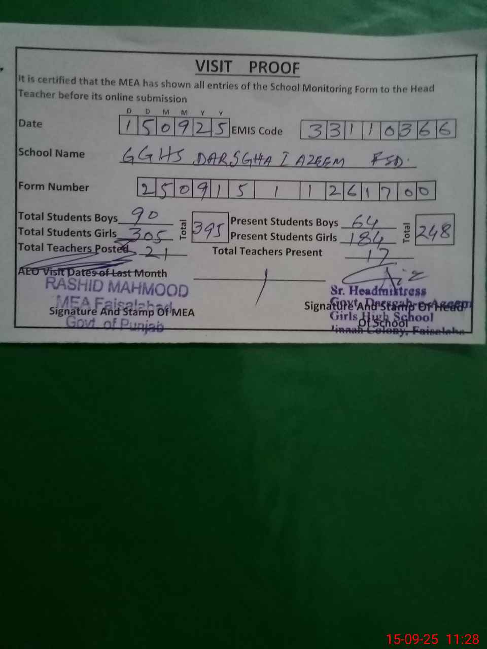 | EMIS Code: 33110366 | Name of School: GGHS DARSGHA I AZEEM FSD JINNAH COLONY | |||