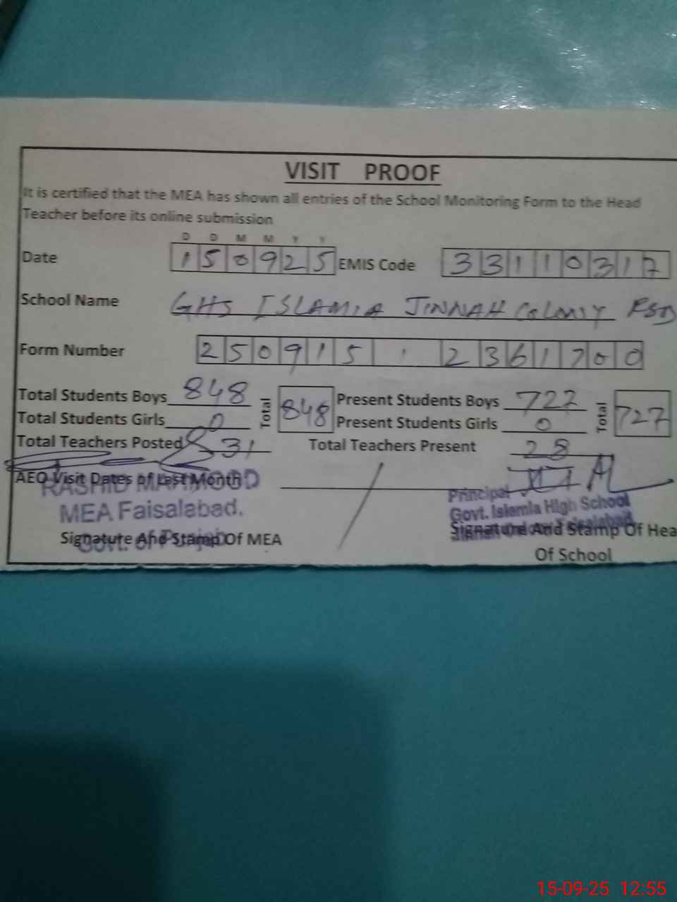 | Attendance Register | Head Teacher | MEA with School | Visit Proof |