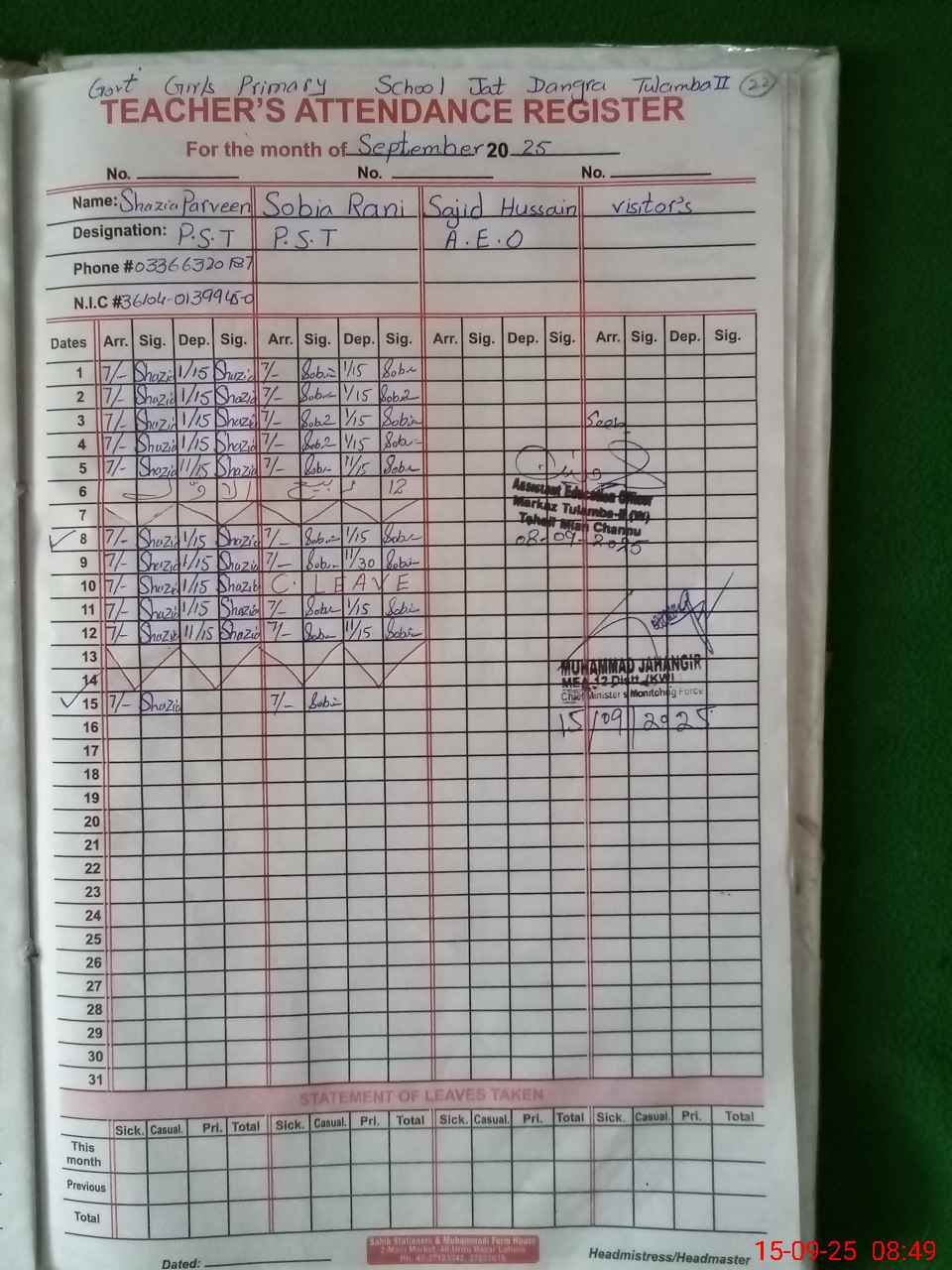 | Name: SH**** PA**** Designation: (School Headmaster's/Headmistress's) PST Phone/Cell Number: 03**** |