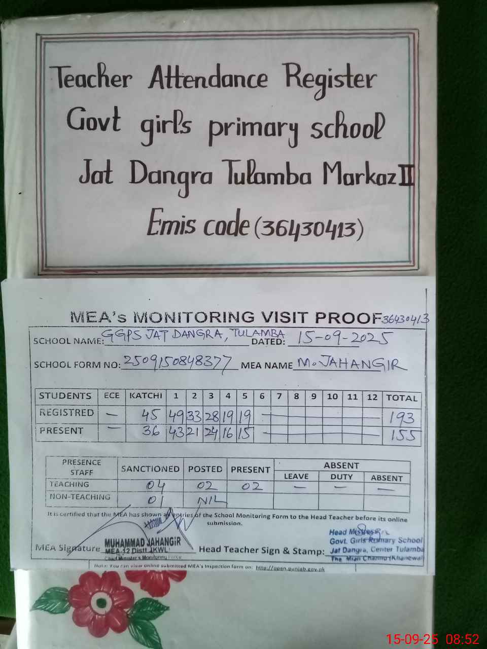 | EMIS Code: 36430413 | Name of School: GGPS JAT DANGRA, TULAMBA | |||