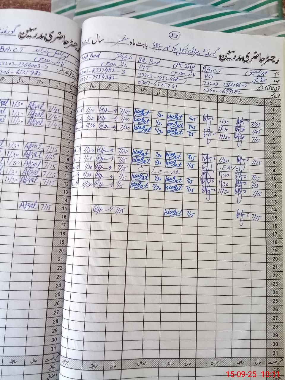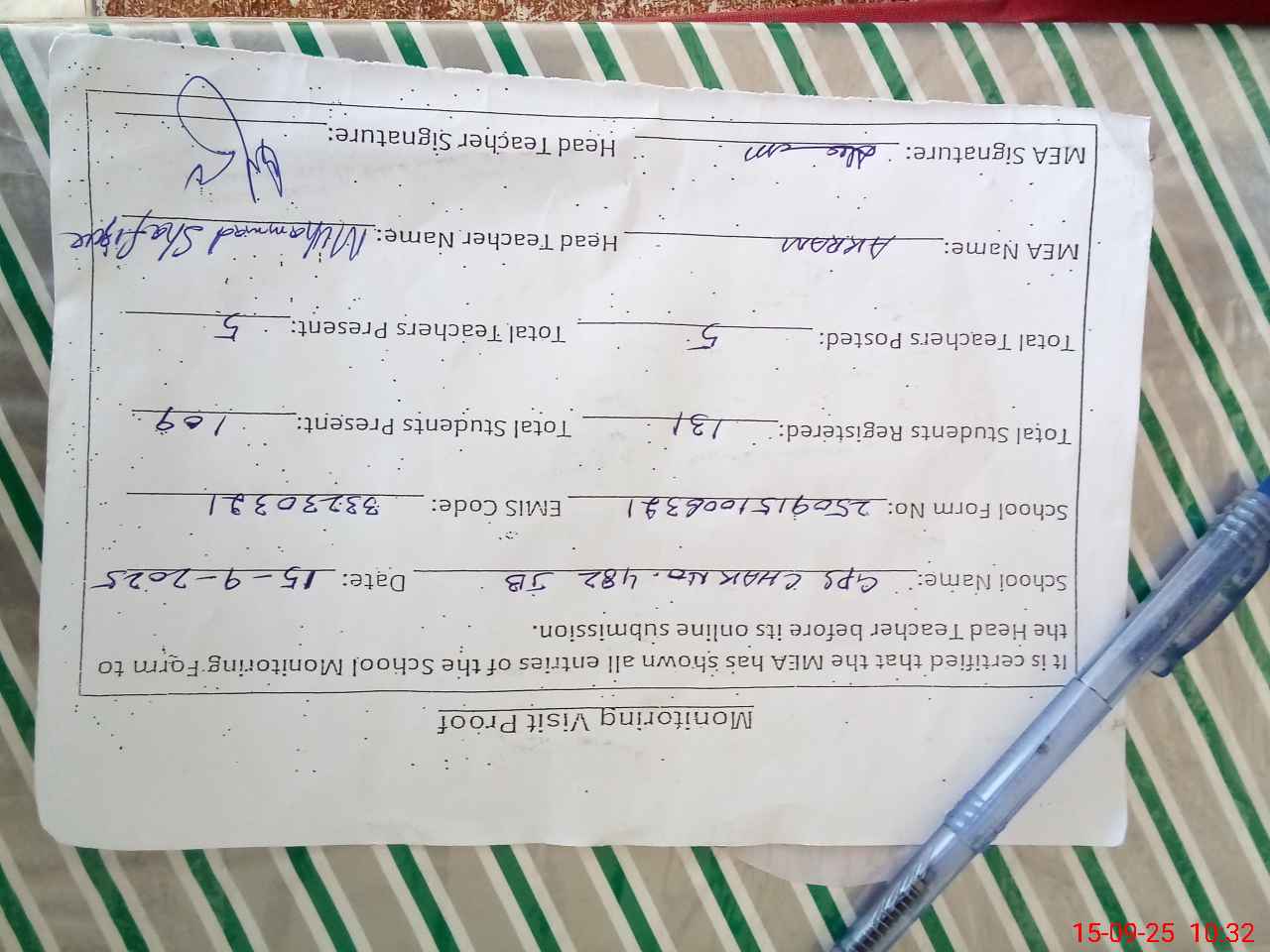 | Name: M.SH**** Designation: (School Headmaster's/Headmistress's) PST Phone/Cell Number: 03**** |