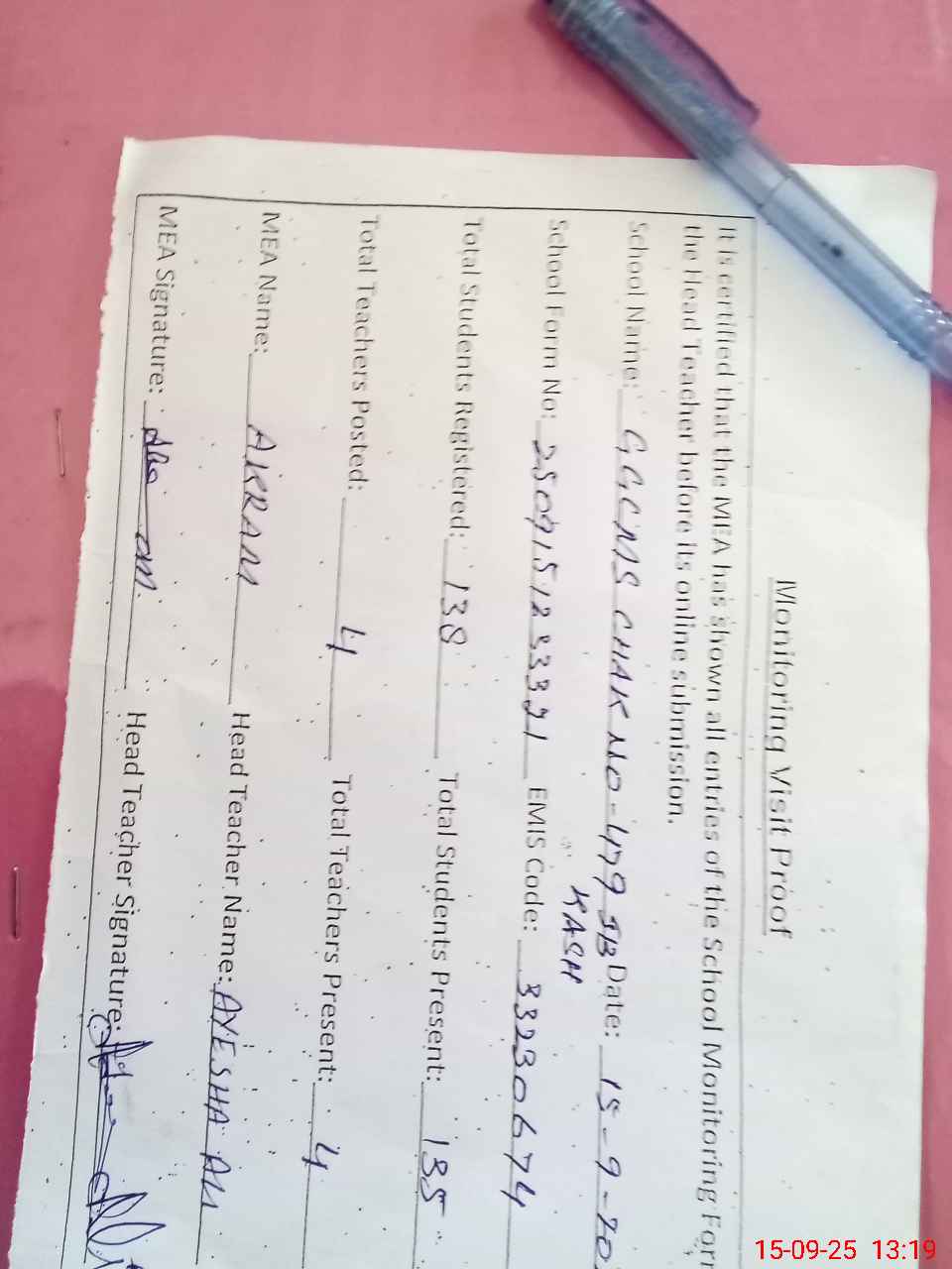 | Attendance Register | Head Teacher | MEA with School | Visit Proof |