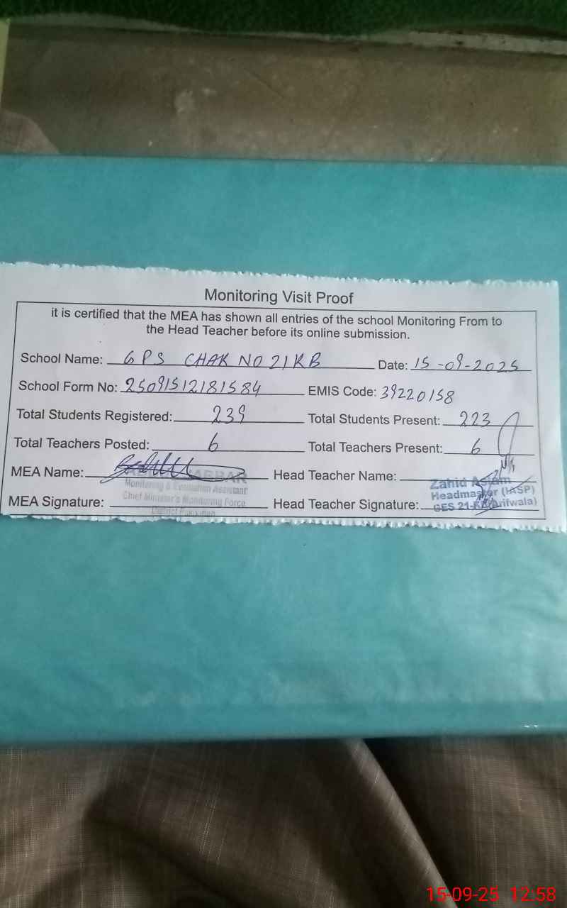 | EMIS Code: 39220158 | Name of School: GPS CHAK NO. 21 KB | |||