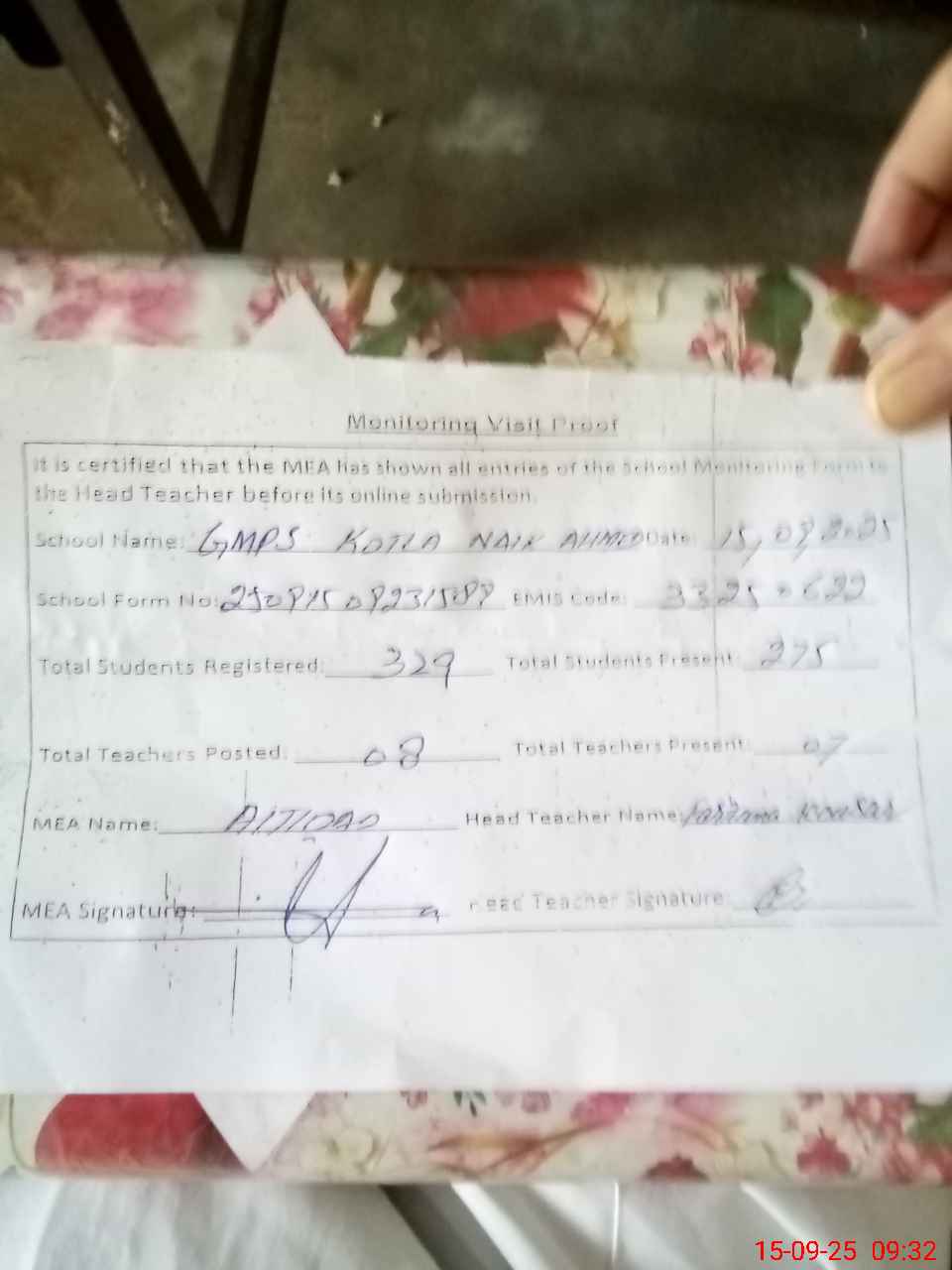 | Attendance Register | Head Teacher | MEA with School | Visit Proof |