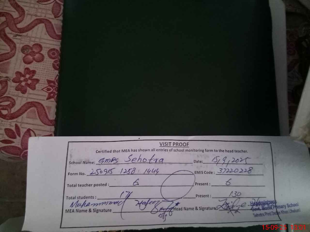 | Attendance Register | Head Teacher | MEA with School | Visit Proof |