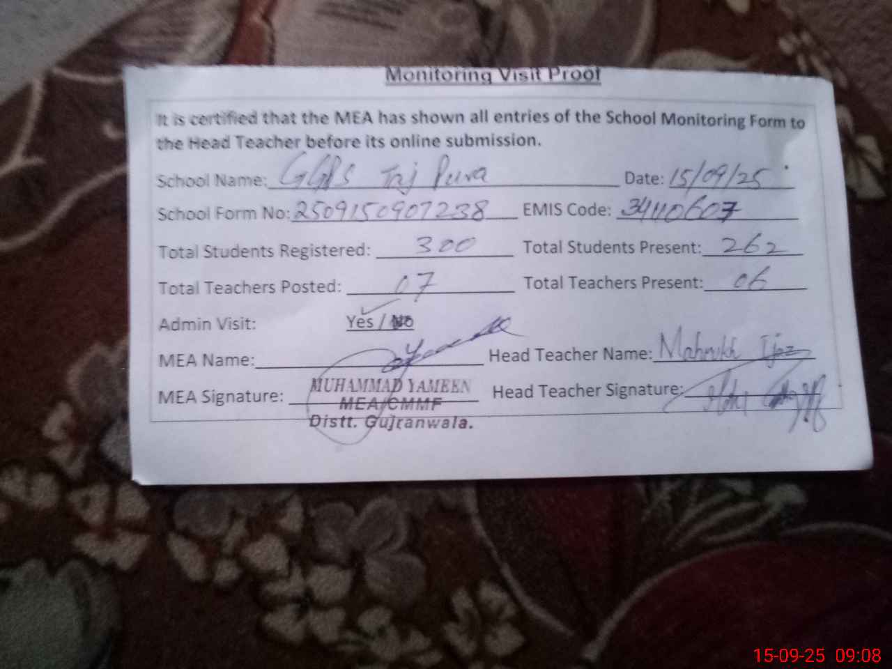 | EMIS Code: 34110607 | Name of School: GGPS TAJ PURA | |||