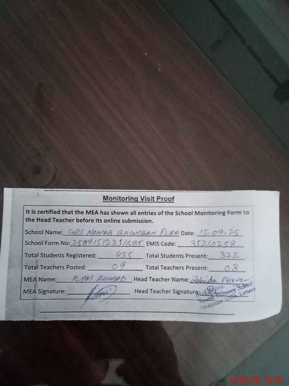 | Attendance Register | Head Teacher | MEA with School | Visit Proof |