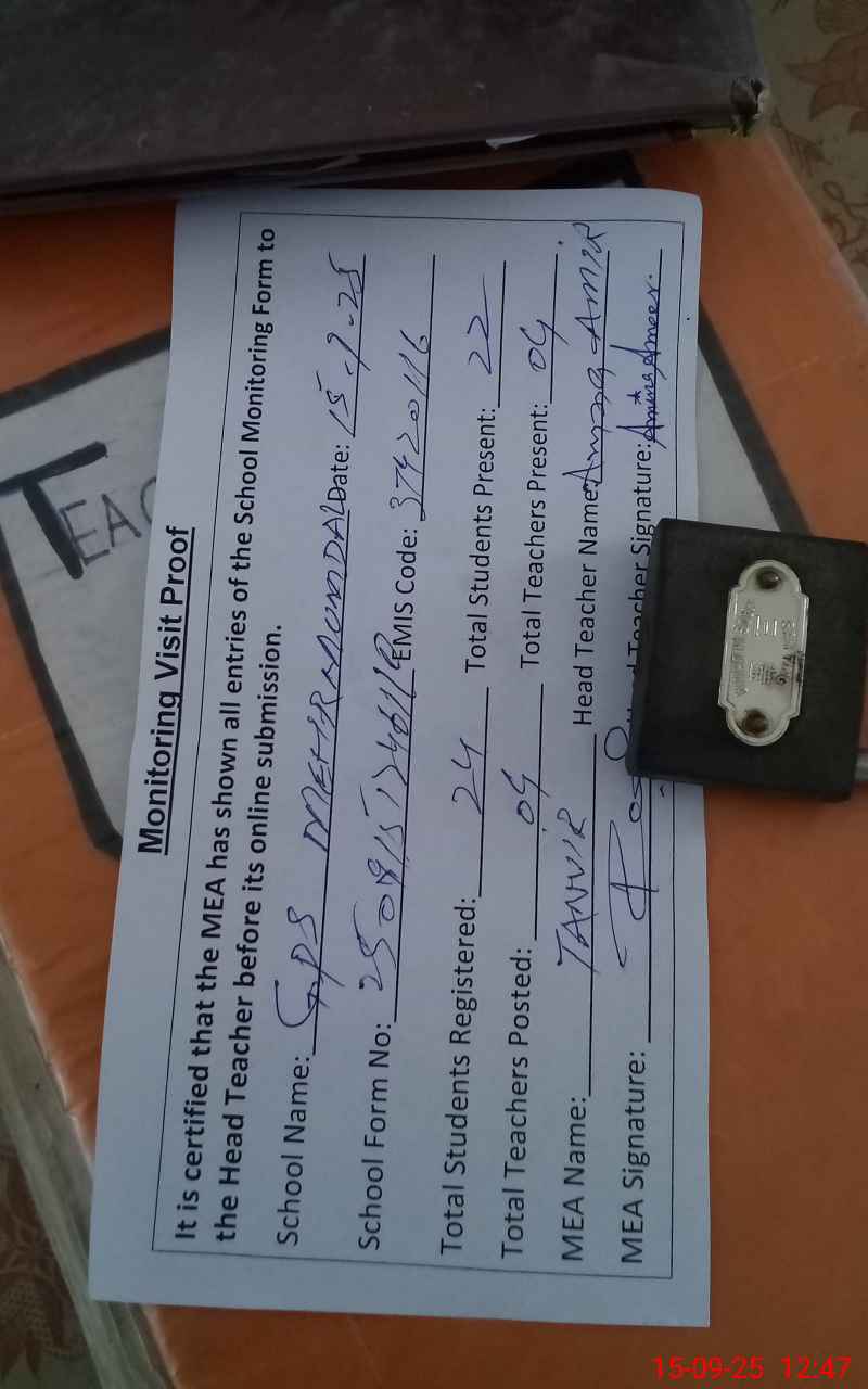 | Attendance Register | Head Teacher | MEA with School | Visit Proof |
