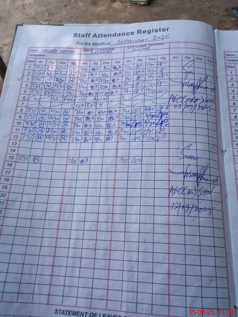 | CNIC | Full Name | Designation | R/C | Absence during last cal. month |