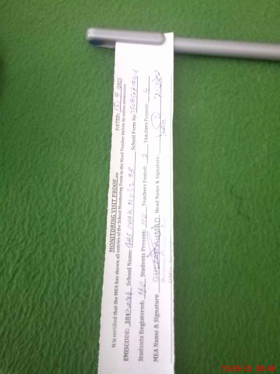 | Attendance Register | Head Teacher | MEA with School | Visit Proof |