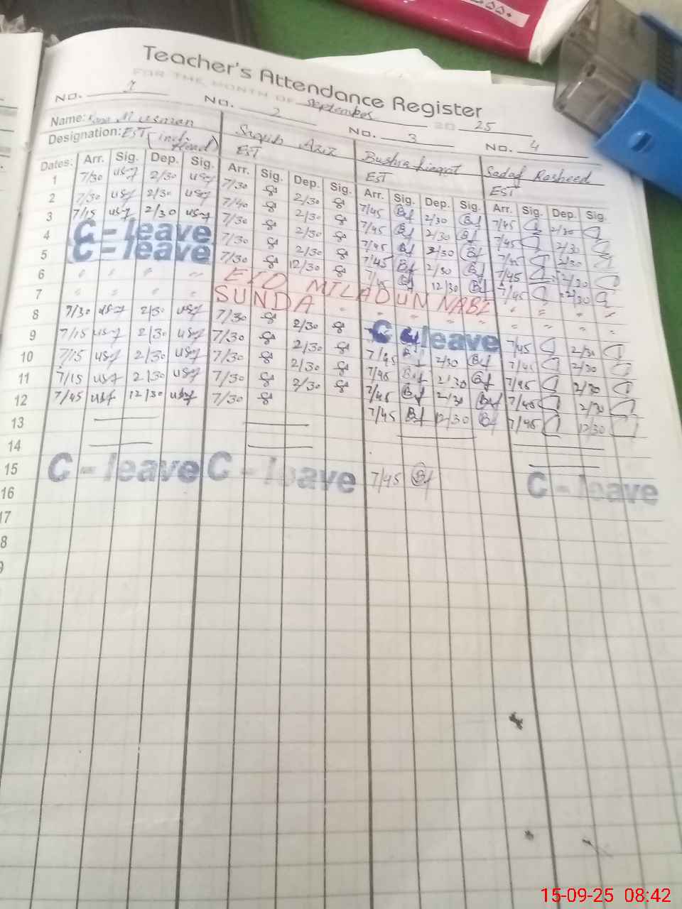 | CNIC | Full Name | Designation | R/C | Absence During Last Calender Month |