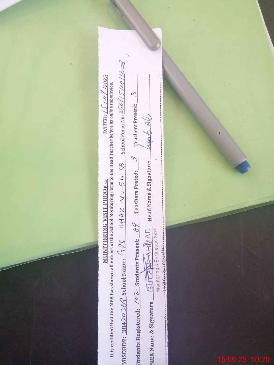 | Attendance Register | Head Teacher | MEA with School | Visit Proof |