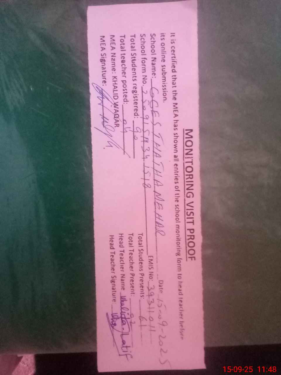 | Attendance Register | Head Teacher | MEA with School | Visit Proof |