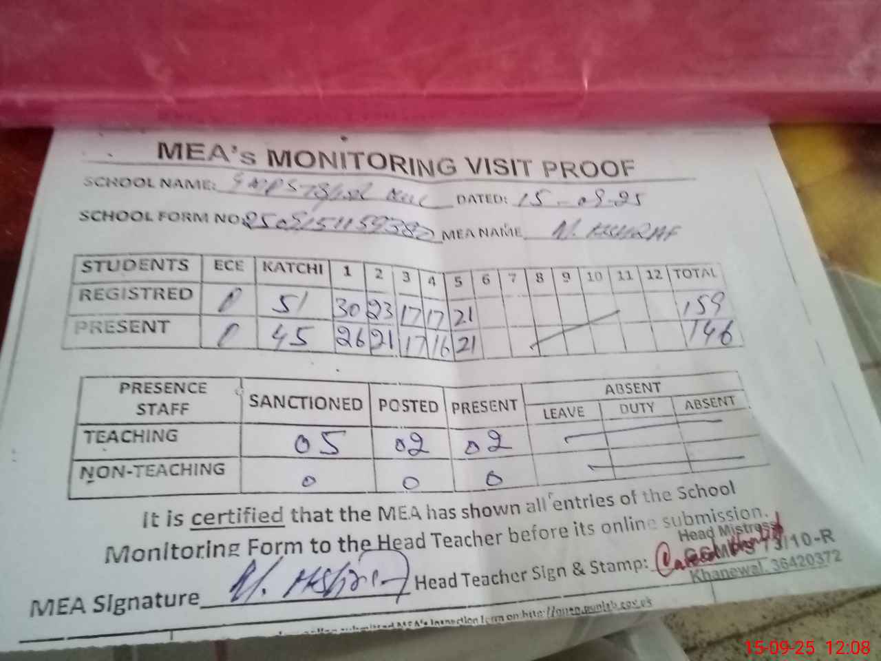 | Attendance Register | Head Teacher | MEA with School | Visit Proof |