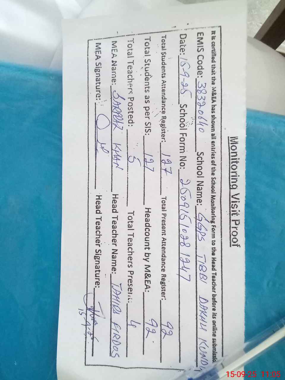 | Attendance Register | Head Teacher | MEA with School | Visit Proof |
