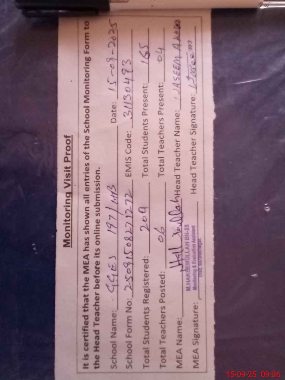 | Attendance Register | Head Teacher | MEA with School | Visit Proof |