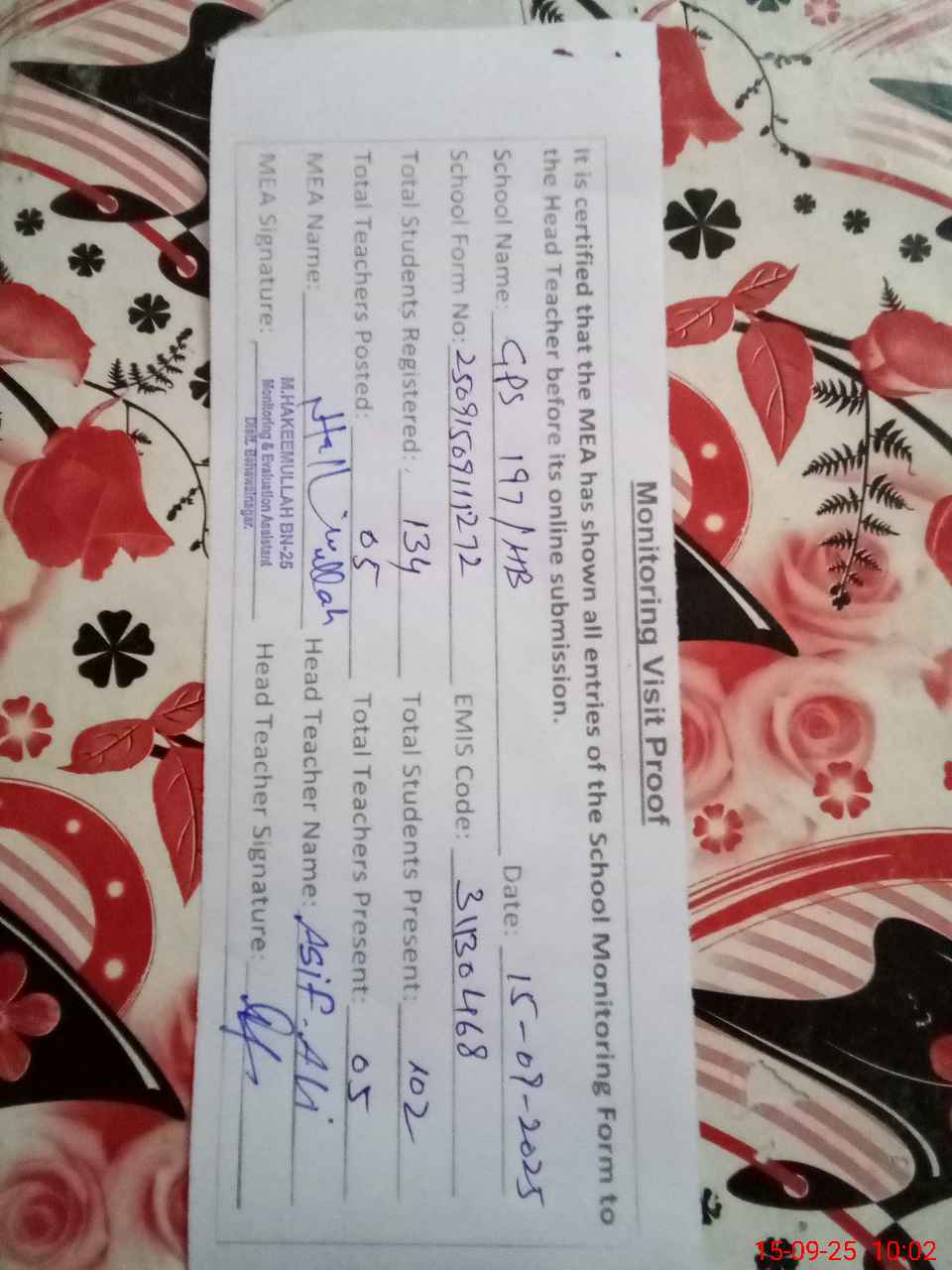 | Attendance Register | Head Teacher | MEA with School | Visit Proof |
