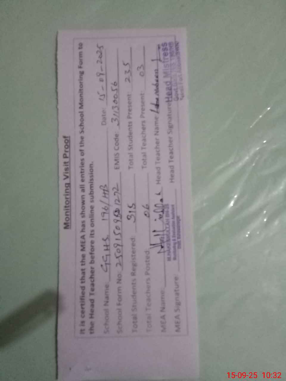 | Attendance Register | Head Teacher | MEA with School | Visit Proof |