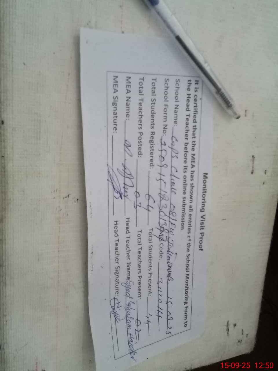 | Attendance Register | Head Teacher | MEA with School | Visit Proof |