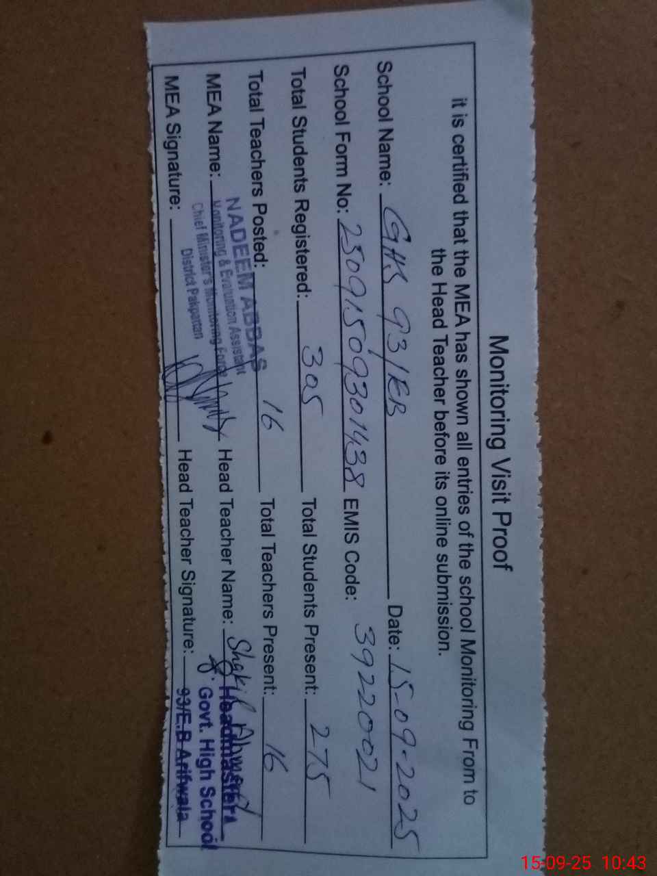 | Certified that this School was Inspected by the Undersigned MEA/DMO Today and the Information Stated Above is as Per Record. | |||||