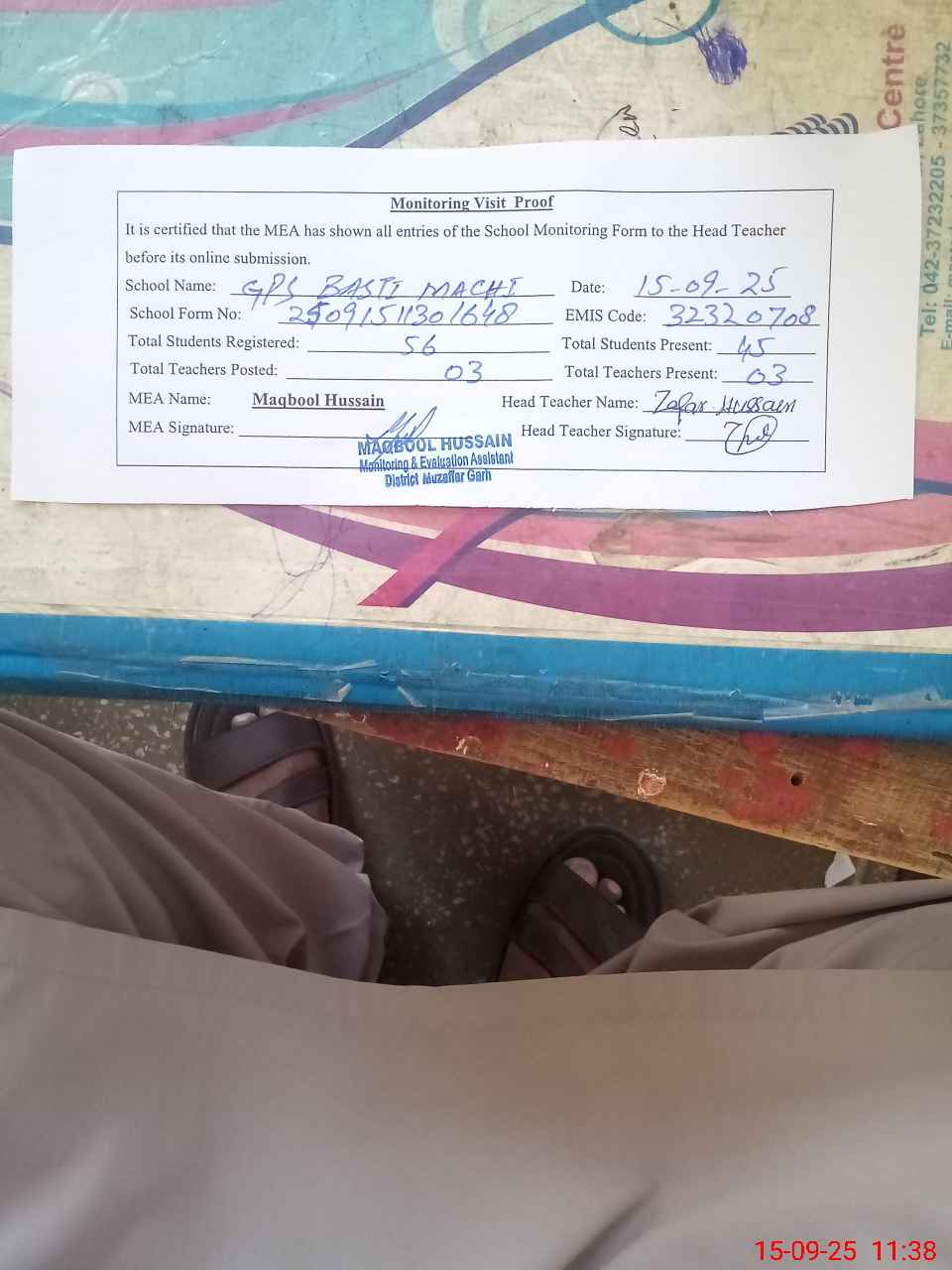 | Attendance Register | Head Teacher | MEA with School | Visit Proof |