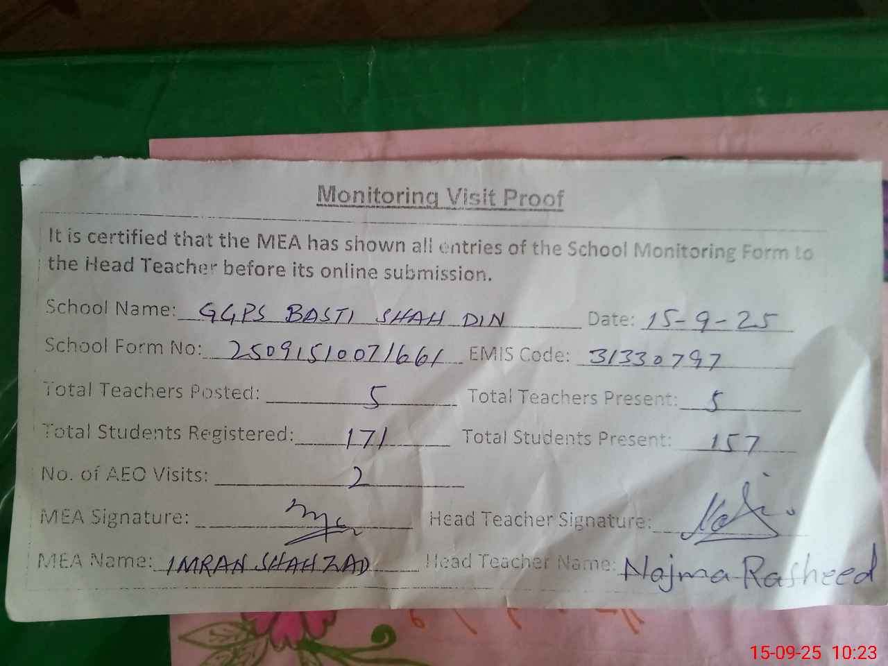 | EMIS Code: 31330797 | Name of School: GGPS BASTI SHAH DIN | |||