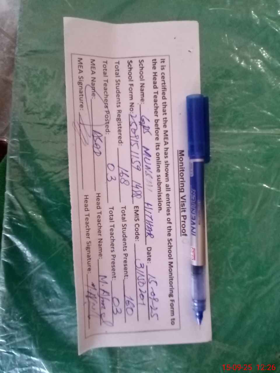 | Attendance Register | Head Teacher | MEA with School | Visit Proof |