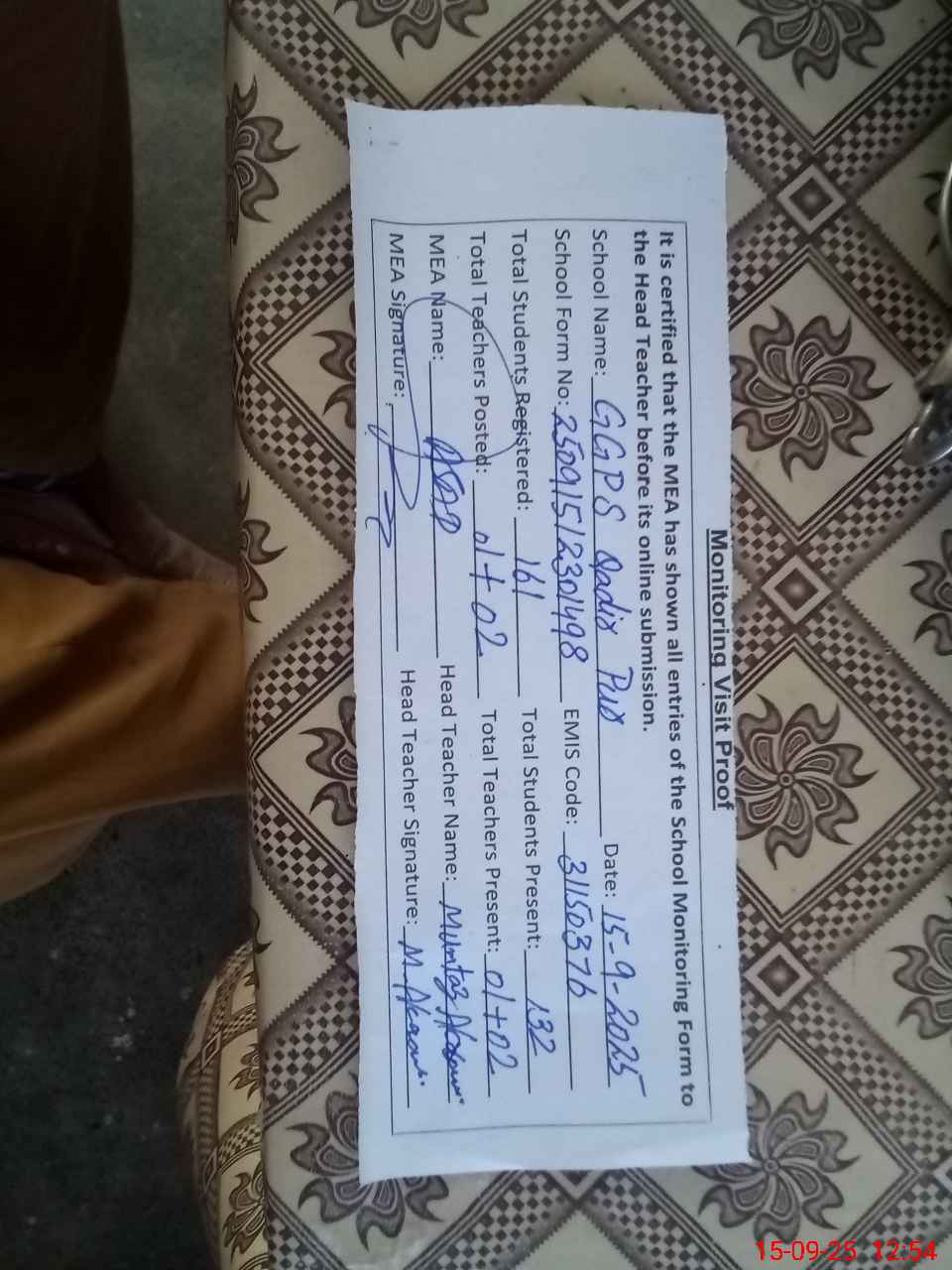 | Attendance Register | Head Teacher | MEA with School | Visit Proof |