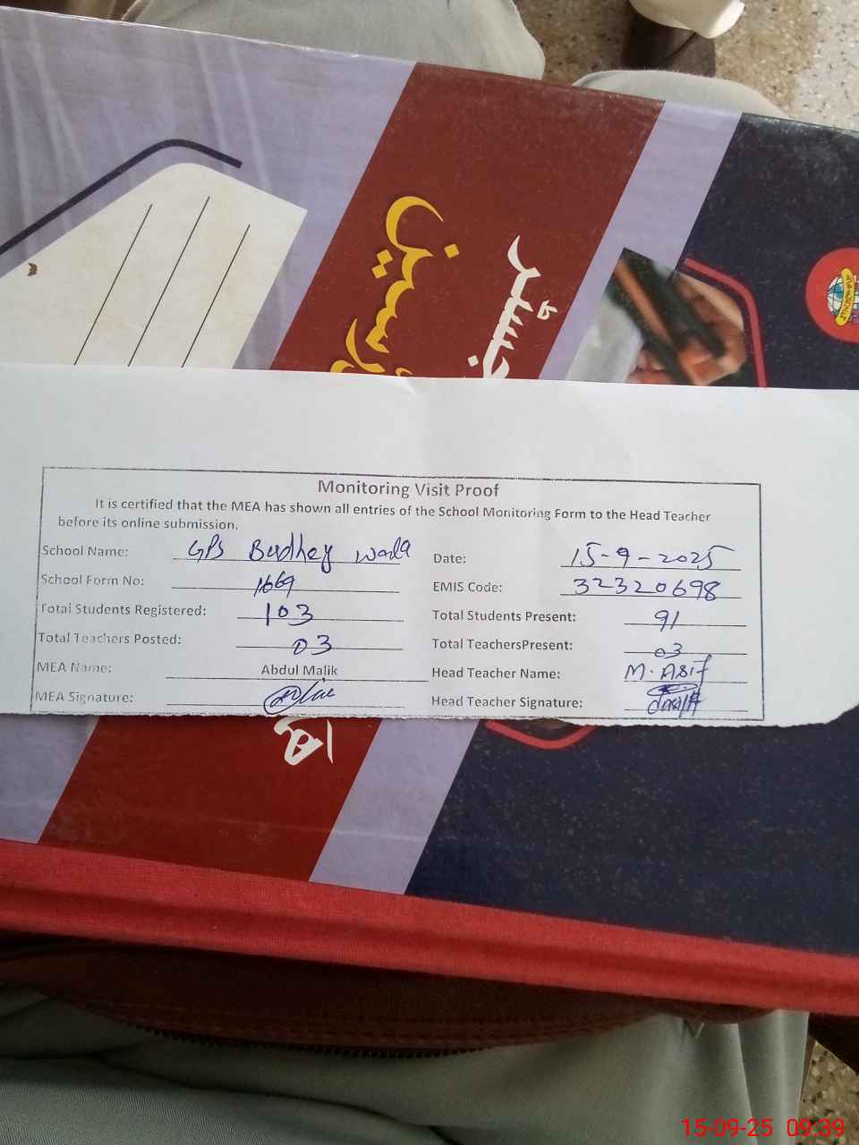 | Attendance Register | Head Teacher | MEA with School | Visit Proof |