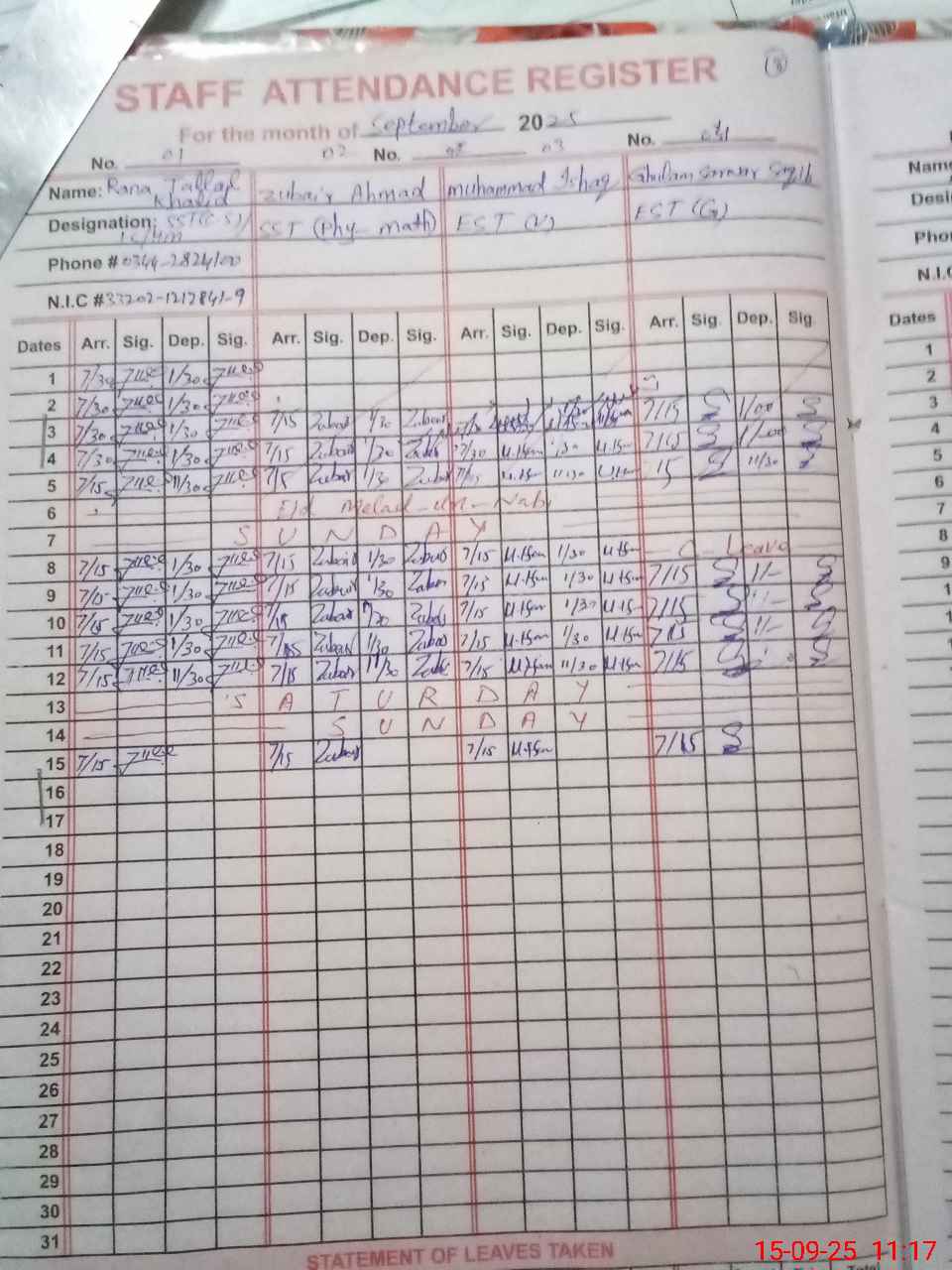 | CNIC | Full Name | Designation | R/C | Absence During Last Calender Month |