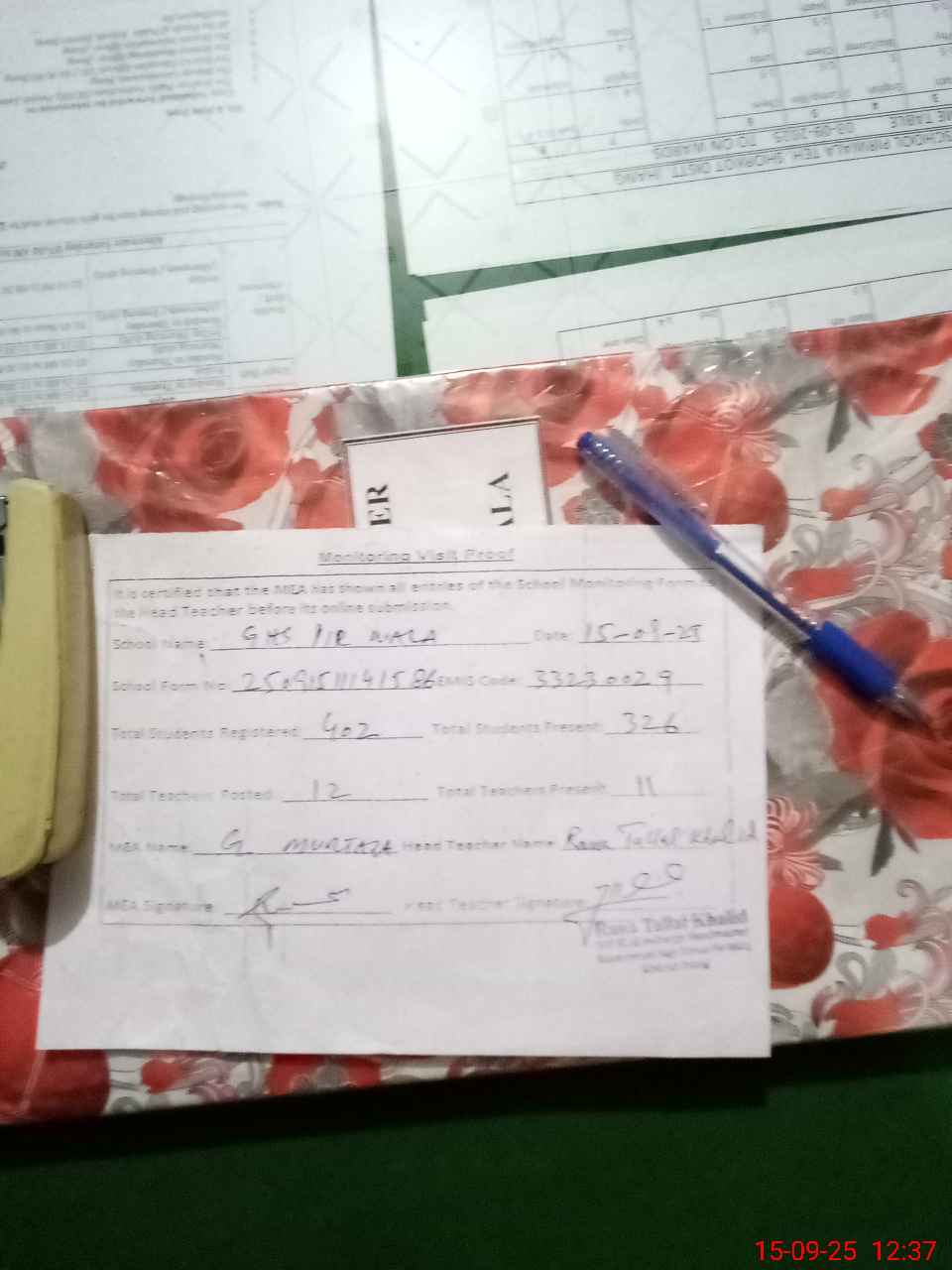| Attendance Register | Head Teacher | MEA with School | Visit Proof |