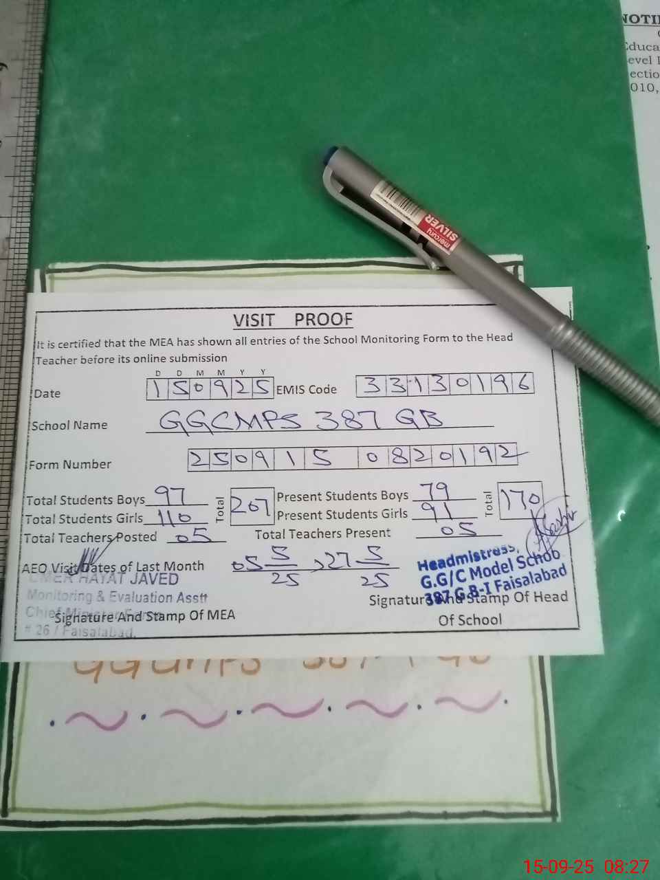 | Attendance Register | Head Teacher | MEA with School | Visit Proof |