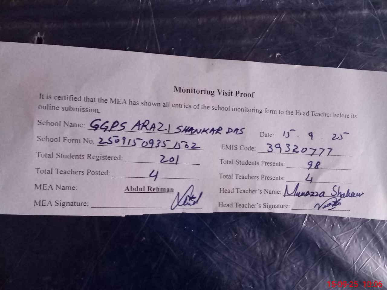 | EMIS Code: 39320777 | Name of School: GGPS ARAZI SHANKAR DAS | |||