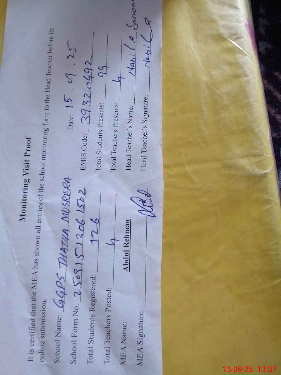 | Attendance Register | Head Teacher | MEA with School | Visit Proof |