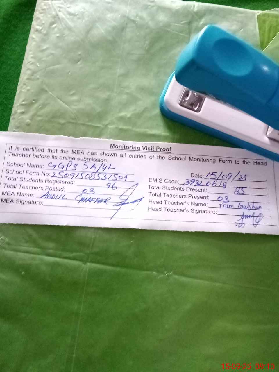 | Attendance Register | Head Teacher | MEA with School | Visit Proof |