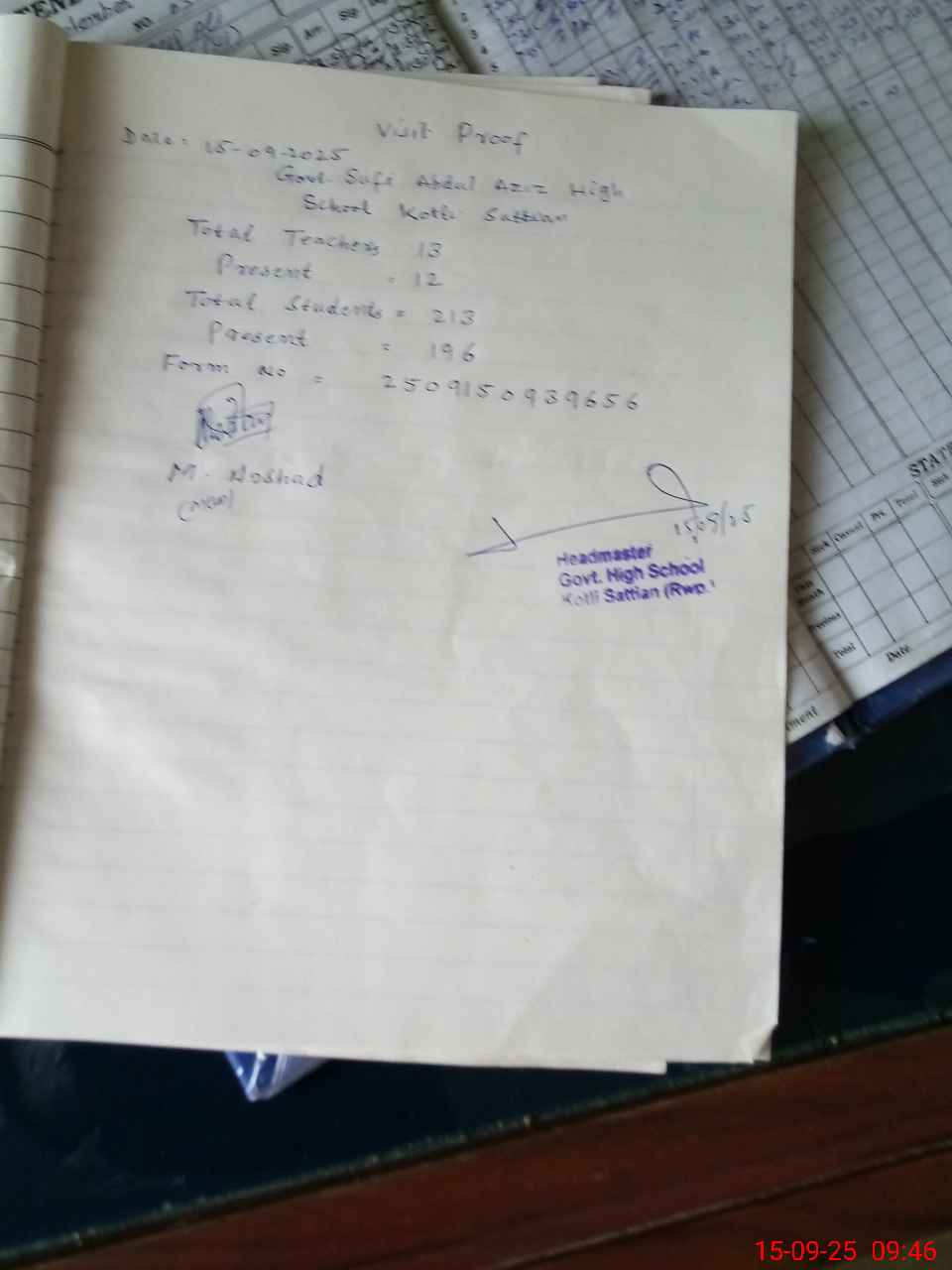 | Attendance Register | Head Teacher | MEA with School | Visit Proof |